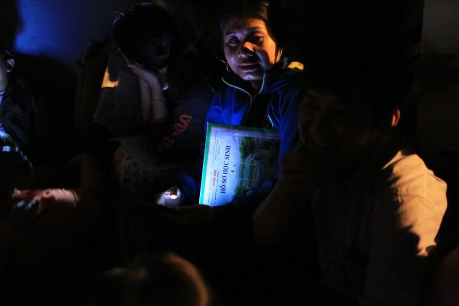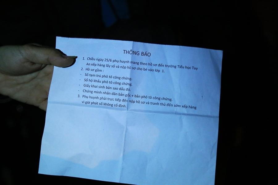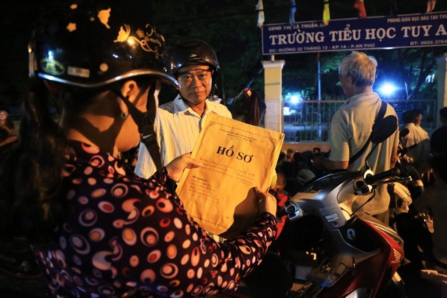 Một phụ huynh kiểm tra kỹ lại hồ sơ cho con để đợi đến sáng đưa vào trường nộp với hy vọng con mình sẽ được vào lớp 1. Ảnh: Văn Dũng