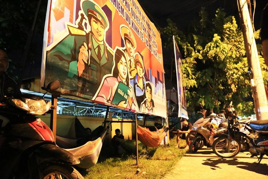 Nhiều phụ huynh mang theo võng, chăn gối để mắc nằm cạnh cổng trường chờ đến giờ được vào nộp hồ sơ. Ảnh: Văn Dũng