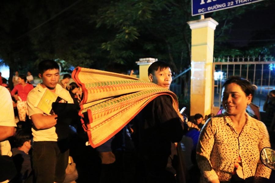 Càng về khuya, lượng phụ huynh đổ về trường ngày càng tăng. Hàng trăm phụ huynh chen chúc nhau ngồi kín trước cổng trường chờ nộp hồ sơ. Ảnh: Văn Dũng