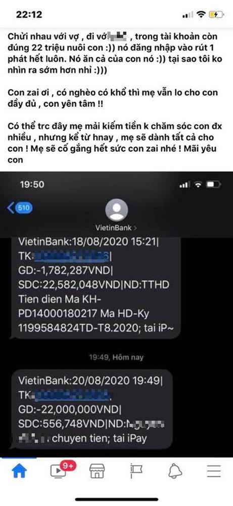 Dưới các bài đăng cũng có "bằng chứng" được share rầm rộ. Đó là việc V.A tố S.H dùng cả tiền nuôi con để ăn chơi.