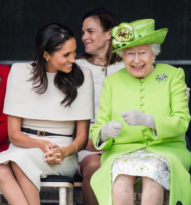 Meghan dường như đang phản chiếu hình ảnh của Nữ hoàng Anh trong khoảnh khắc này. Meghan ngồi thẳng lưng, hai tay nắm vào nhau và rõ ràng Meghan đang cố gắng "sao chép" tư thế trang trọng và trang nhã của Nữ hoàng Anh.