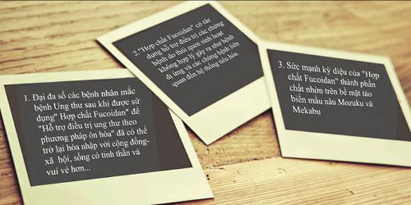 “Hợp chất Fucoidan” chứa trong tảo biển có thành phần chủ yếu là một chuỗi phân tử Polysaccharide có chứa Sulfate fucose- hợp chất nhờn chỉ có ở những loại tảo nâu như Mozuku, Mekabu và Kombu. Hợp chất Fucoidan đã được chứng minh là có nhiều công dụng tốt cho sức khỏe như phát hiện đột phá về khả năng hỗ trợ chống ung thư đã được kiểm chứng lâm sàng mới là công dụng đặc biệt, gây tiếng vang lớn.
