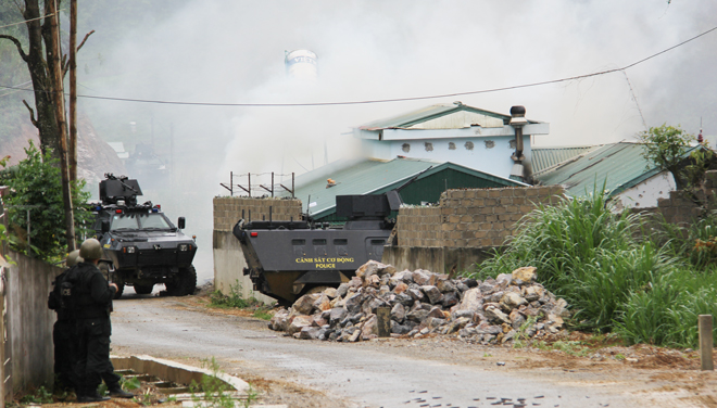 Hơn 300 cán bộ, chiến sĩ tinh nhuệ bố trí thành ba vòng vây, tạo thành thế trận liên hoàn, khép kín tấn công vào “đại bản doanh” của hai tên “trùm” ma túy… Ban chuyên án tiếp tục phát loa kêu gọi các đối tượng buông súng đầu hàng để nhận được sự khoan hồng của pháp luật, tuy nhiên các đối tượng cố thủ trong nhà, dùng súng, lựu đạn, bom xăng điên cuồng chống trả lực lượng Công an. Ban chuyên án buộc phải nổ súng uy hiếp. Lúc này, 3 đối tượng buông súng và ra đầu hàng.