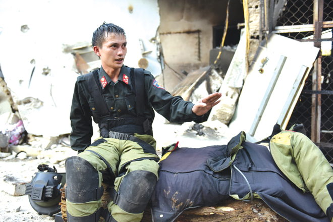 Phút giây nghỉ ngơi chớp nhoáng của người lính rà phá bom mìn.