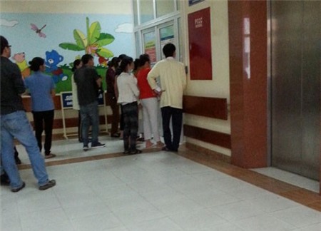 Cách đó không xa, anh Bình đến từ thành phố Bắc Giang vẫn đứng bám vào cột hành lang bệnh viện nhìn đáu đáu vào phòng điều trị phía sau cánh cửa kính bị bịt kín mít. Anh không giấu được sự lo lắng khi con trai 8 tháng tuổi của anh đang nằm thở ô xy ở trong.