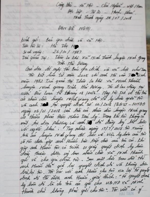 Cũng theo chị H., ngày 17/7, chị làm đơn gửi đến Viện Kiểm sát nhân dân huyện Ninh Giang, Viện Kiểm sát nhân dân và Tòa án nhân dân tỉnh Hải Dương đề nghị xem xét, làm rõ vụ việc.