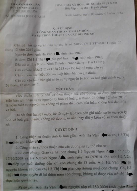 Trao đổi với PV, ông Hà Văn A. (bố chồng chị H.) kể, cách đây khoảng 3 tháng vào khoảng 17h chiều, ông nhận được Quyết định số 02 công nhận thuận tình ly hôn và thỏa thuận của các đương sự của TAND huyện Ninh Giang ban hành ngày 3/1/2018 do Thẩm phán Đàm Nhân Trác ký, trong đó công nhận ly hôn giữa con trai ông và con dâu. Khi xem nội dung, ông A. quá bất ngờ khi không hề biết sự việc và sau đó gọi điện cho con dâu (chị H.) đang ơ nước ngoài báo tin.