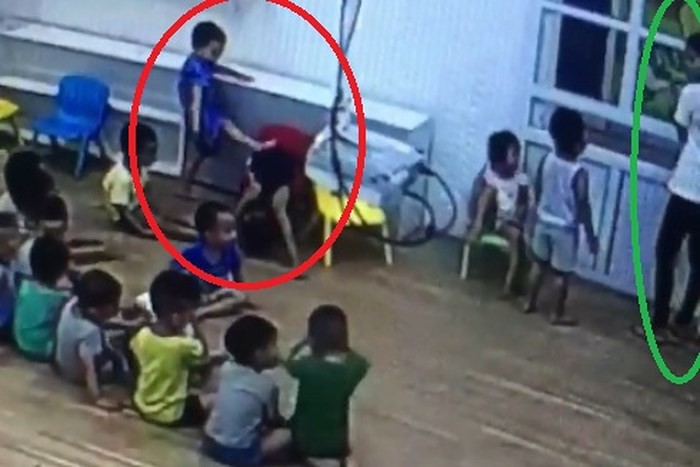 Hành động va chạm của các bé diễn ra ngay trong lớp nhưng không được các cô phát hiện và can thiệp kịp thời. Ảnh cắt từ clip