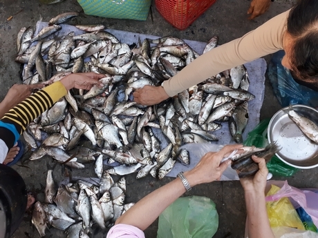 Người bán không kịp rao và người mua thì cũng “tự động ngồi xuống lựa”. Cá linh, cá mè, cá he,… “lớn nhỏ đủ loại, chỉ giá 30.000 đ/ký”. Vừa lựa cá, chị Võ Thị Năm (ngụ ở ấp Nhơn Trí, xã Nhơn Bình) cho biết, vừa mua cá lóc đồng, thấy “cá trắng” này “tươi, rẻ quá thấy ham” nên lựa hơn 2 ký.