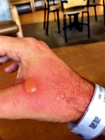 Ngoài việc da tay bị bỏng, ông còn bị chóng mặt, buồn nôn và phải điều trị ở bệnh viện bằng thuốc steroid và thuốc kháng histamine.