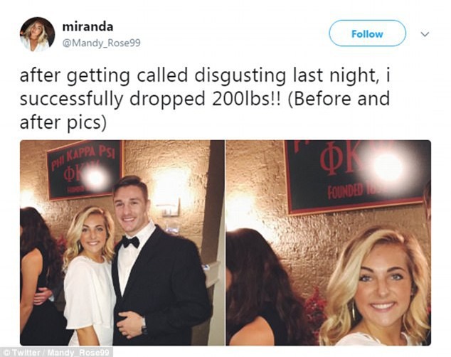 Trên tài khoản Twitter hôm 12/11 vừa qua, Miranda đã chia sẻ: “Sau khi bị gọi là đồ kinh tởm và kém hấp dẫn, tôi đã thành công giảm ngay được 90 ký! (Dưới đây là hình trước và sau khi giảm)”.