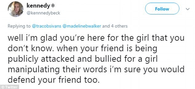 Bên cạnh hàng ngàn lời chia sẻ động viên thì một tài khoản Twitter tên Kennedy lại có một suy nghĩ khác. Cô nói: “Thật buồn cười là chẳng ai biết sự thật xảy ra thế nào. Nhưng gọi hành động của người khác là kinh tởm cũng không nói lên được con người thật sự của ai đó…”