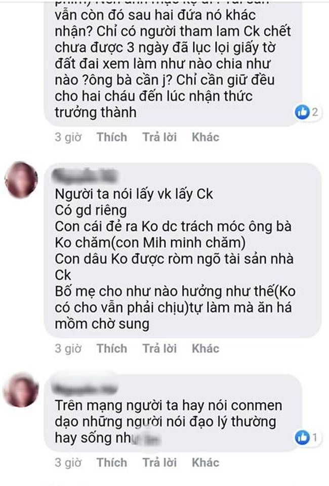 Được biết, giá trị tài sản anh Hùng để lại khoảng hơn 4 tỷ. Mẹ chồng Nhung yêu cầu chia 5 và mỗi người sẽ thừa hưởng khoảng 800 triệu. Quan niệm phía nhà chồng Nhung là: Lấy chồng phải theo nhà chồng, anh ấy mất đi rồi thì tài sản phải là của nhà chồng, nhà chồng cho gì thì biết nấy. Là con cái phải chăm sóc bố mẹ chứ bố mẹ không phải hỏi han con cái.