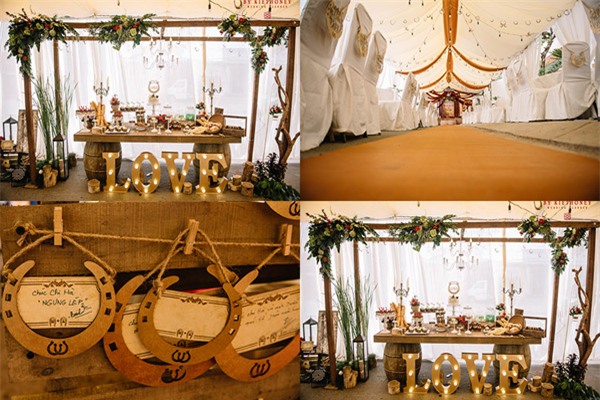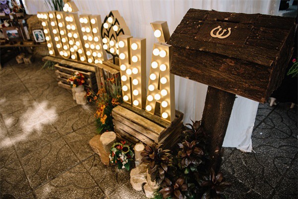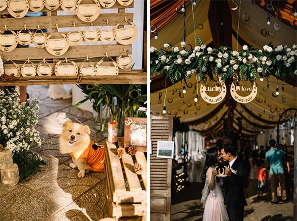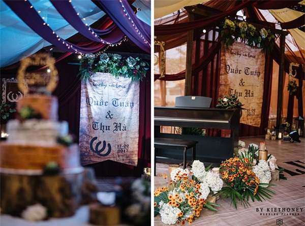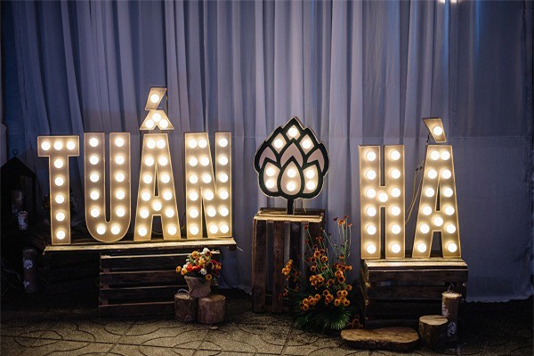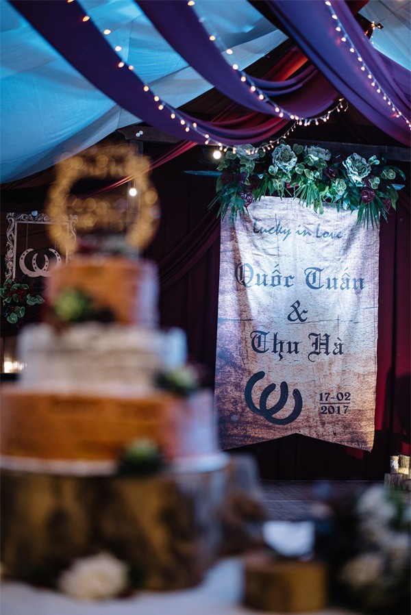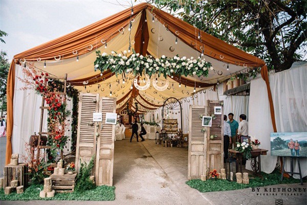 Điểm nhấn đặc biệt trong tiệc cưới này được đầu tư từ cổng hoa, bàn bánh, bàn tiệc, lối đi, sân khấu. Cổng hoa được thiết kế bằng bốn cánh cửa mộc mạc, đính kết hoa artiso. Gian lều rạp được trang trí đặc sắc với ánh sáng từ những bóng đèn dây tóc được thiết kế cầu kỳ tạo nên một khung cảnh không kém phần lãng mạn cũng như để khách mời có thể cảm nhận được sự may mắn trong tình yêu cặp nhân vật chính đang lan toà khắp không gian tiệc cưới.