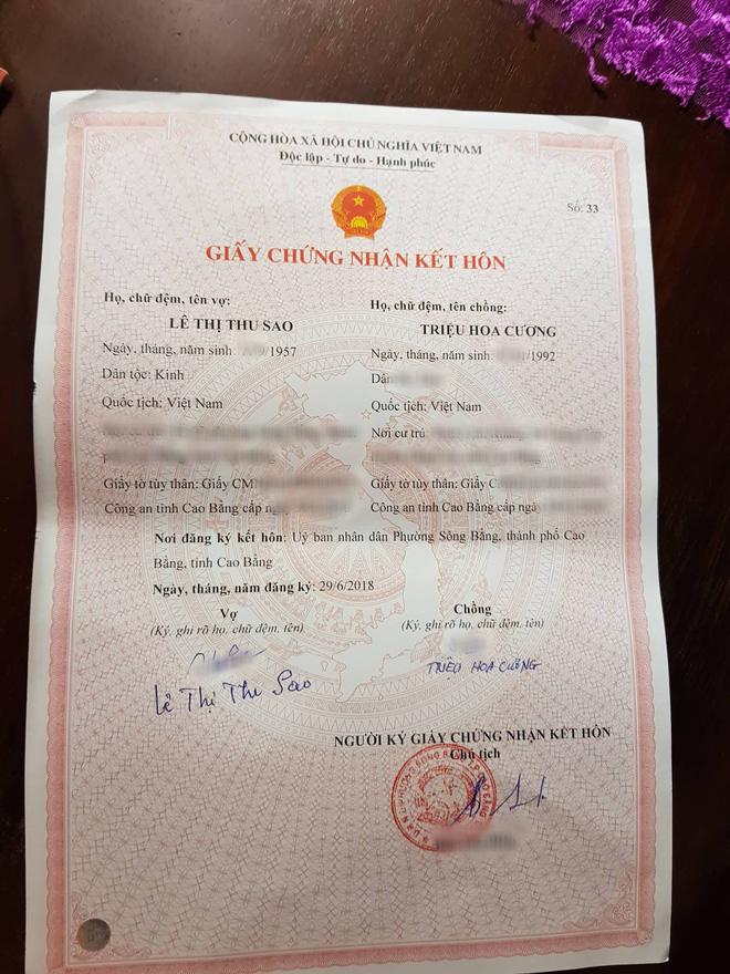 Liên hệ với nhân vật ch ính của câu chuyện, anh Triệu Hoa Cương sinh năm 1992 ở Cao Bằng cho biết mình năm nay 26 tuổi, còn vợ là Lê Thị Thu Sao sinh năm 1957 cũng ở Cao Bằng và năm nay 61 tuổi. Hai người quen nhau vào tháng 12 năm 2017 qua mạng xã hội Facebook, sau khi biết chị Sao mở Spa làm đẹp anh đã trở thành một khách hàng thân thiết. Sau hai tháng đến chăm sóc da mặt, anh đã làm quen và hai người yêu nhau lúc nào chẳng biết đến tận bây giờ.