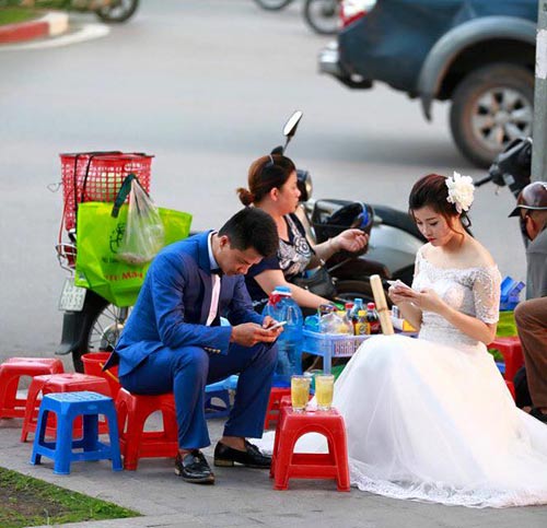 việc” của cặp cô dâu – chú rể đang uống trà đá đã tạo một ấn tượng mạnh