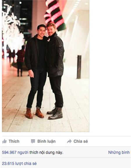 Câu chuyện tình yêu đầy duyên nợ của cặp đôi đồng tính Mỹ đã hút hơn 500.000 Like chỉ sau vài giờ đồng hồ. Rất nhiều bình luận chia sẻ với cặp đôi này về tình yêu "định mệnh".