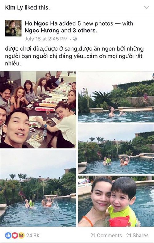 Sau khi đêm nhạc Love Songs của Hồ Ngọc Hà kết thúc, Pha Lê bất ngờ tiết lộ những chi tiết đầy thú vị xoay quanh chuyện tình giữa giọng ca "What Is Love" và Kim Lý. "Chị và người đàn ông ấy quấn nhau không rời 1 bước, anh ta thì luôn hôn chị, không rời mắt khỏi chị lấy 1 giây, và đêm nay anh cũng ngồi đó nhìn chăm chăm vào chị" - Pha Lê viết.