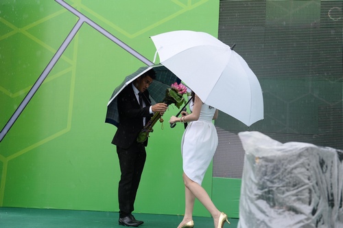 Thủy Tiên được Công Vinh che ô tránh mưa trên sân khấu