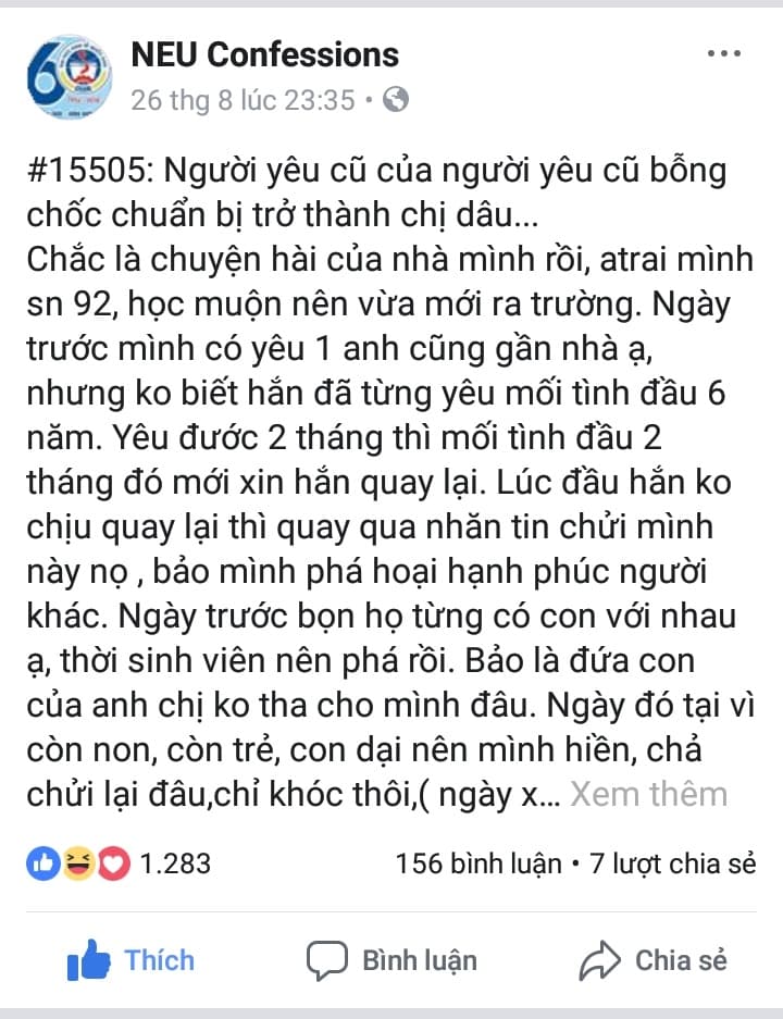 Bài viết trên trang NEU Confessions chia sẻ về việc người yêu cũ của người yêu cũ bỗng chốc chuẩn bị thành chị dâu, đã khiến hàng ngàn chị em điên đảo like và share hưởng ứng câu chuyện rắc rồi này.