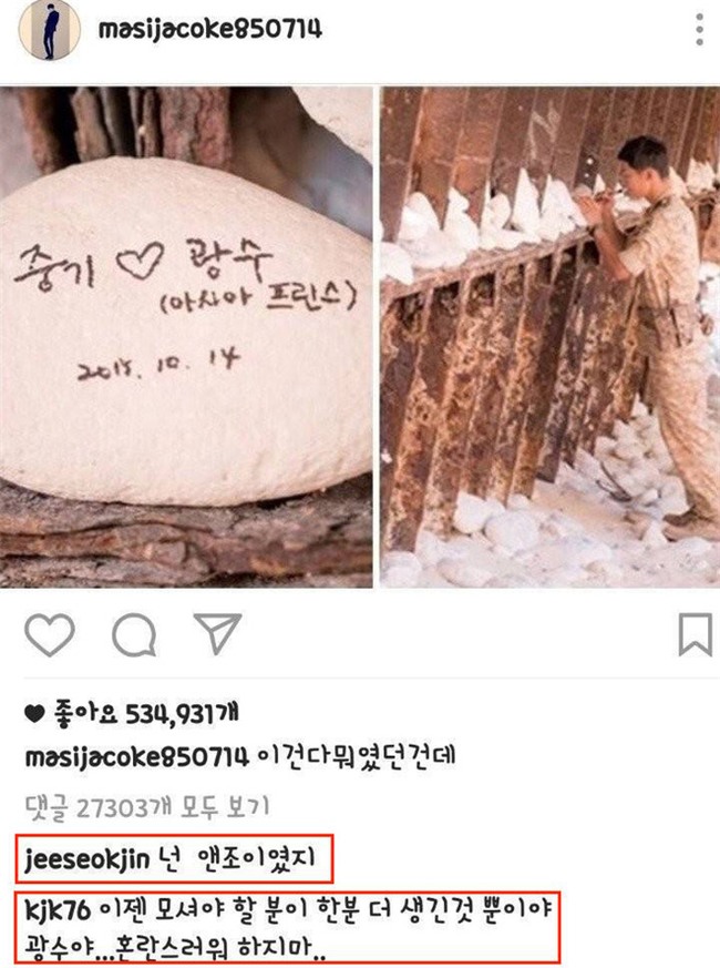 Hành động của Song Joong Ki khiến cả ê-kíp chụp hình cảm thấy khó hiểu. Tuy nhiên, sau đó, khi phim Hậu duệ mặt trời được lên sóng nhiều người cho rằng có thể đây là cách hành xử lịch sự của nam tài tử họ Song với người bạn diễn là đàn chị nổi tiếng.