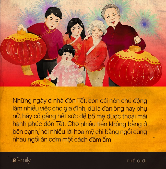 Mặc dù người ta thường nói rằng không ai phục vụ cho ai, nhưng theo đức tính truyền thống của người Á Đông, những ngày ở nhà đón Tết, con cái nên chủ động làm nhiều việc cho gia đình, dù là đàn ông hay phụ nữ, hãy cố gắng hết sức để bố mẹ được thoải mái hạnh phúc đón Tết. Cho nhiều tiền không bằng ở bên cạnh, nói nhiều lời hoa mỹ chi bằng ngồi cùng nhau ngồi ăn cơm một cách đầm ấm.