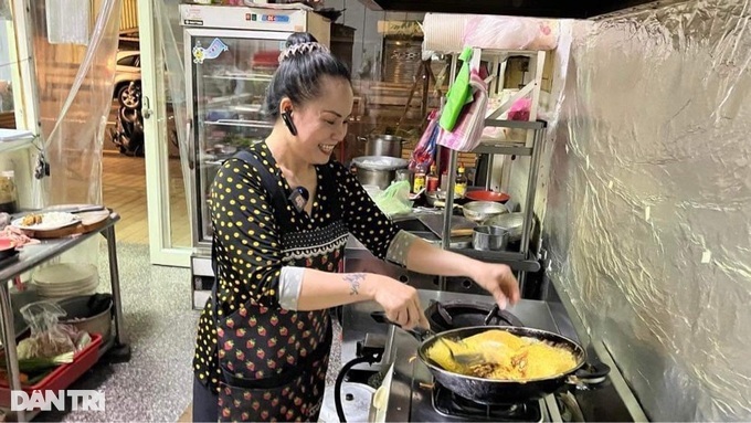 Chị Sương đổ bánh xèo tại "Quán bà Sương" ở Đài Loan.