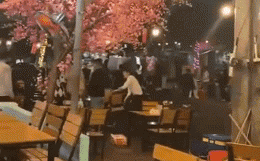Bất ngờ, 2 thanh niên đứng vòng trong cầm chiếc ghế gỗ ở bàn nhậu phang mạnh vào người nhóm đối phương. Tiếng chai bia, đồ thủy tinh vỡ loảng xoảng.