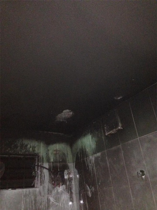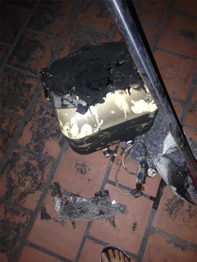Vẫn chưa hết bàng hoàng sau sự cố bất ngờ, bạn T.T cho biết thêm: "Dập tắt được đám cháy rồi mà tim mình vẫn đập thình thịch. May mắn là chưa có ai bị thương. Bình nóng lạnh rơi xuống vỡ luôn cả bồn cầu. Sau sự cố, mình có gọi cho thợ, họ nói bị move cái dây ngắt vì nó quá tải không ngắt được nên bị chập và nổ".