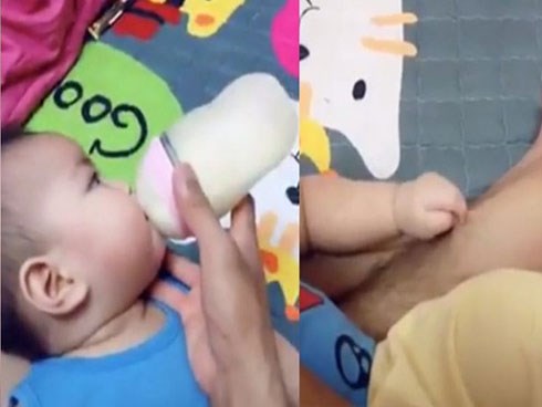 Em bé vừa dứt lông chân bố vừa thảnh thơi ti sữa