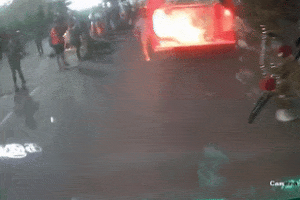Đoạn clip gây sốc cho thấy chiếc ô tô trượt trên đường, tông vào lề đường rồi bay lên không trung. Cuối cùng, nó dừng lại ở phía trước một trong những ngôi nhà. Sau đó, ba người tìm cách bước ra khỏi chiếc xe ô tô.
