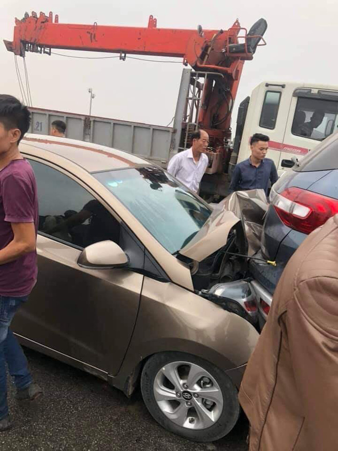 Xe này húc thẳng vào đuôi xe kia, tạo thành chuỗi dài các xe ô tô nằm bất động giữa cầu. Hình ảnh ở hiện trường cho thấy các xe bị hư hại nghiêm trọng phần capo và đuôi.