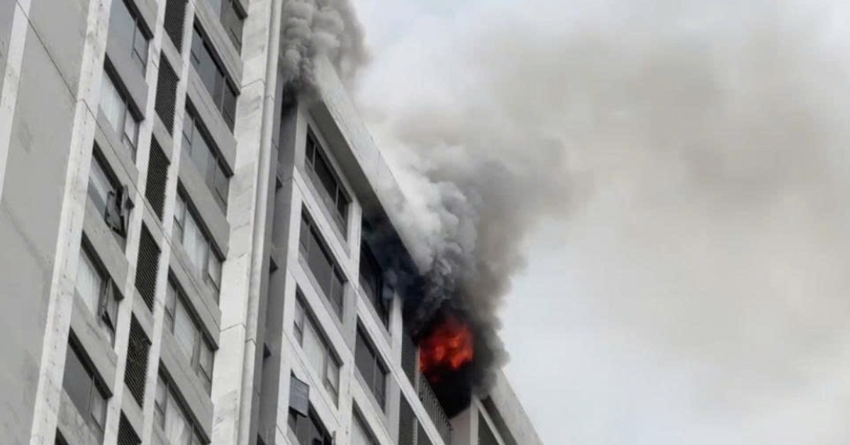 Sau ít phút, lửa bốc ra từ cửa sổ căn hộ, cột khói bốc cao. Lúc này, một số cư dân cùng bảo vệ đã cố gắng chữa cháy bước đầu.