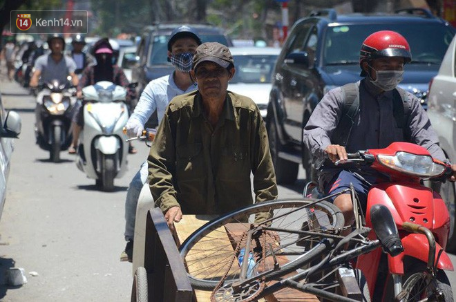 Dù trời nắng nóng đến mức chẳng ai muốn mò ra đường, thì những người lao động vẫn phải "chinh chiến" với đủ thứ phụ kiện che chắn. Từ áo khoác, khẩu trang, đến cả găng tay và kính râm. Nhưng có vẻ nhiêu thứ đó cũng không giúp họ vơi đi cực nhọc khi nền nhiệt cứ "hầm hập" 42 - 43 độ C.