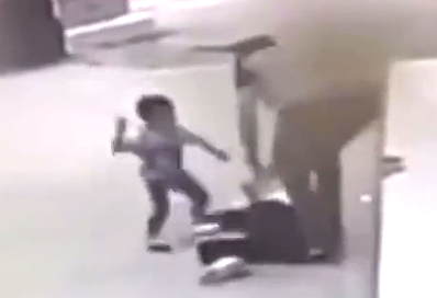 Cậu bé chạy ra ngăn cản bố đánh mẹ. Ảnh cắt từ clip.