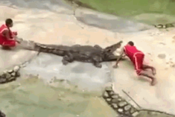 Vài giây sau đó, người đàn ông lại cho tay vào miệng con vật lần nữa. Đáng tiếc là lần này con cá sấu đã phản xạ nhanh hơn đối phương. Do không rút được tay ra ngoài, nạn nhân đau đớn, la hét thất thanh.