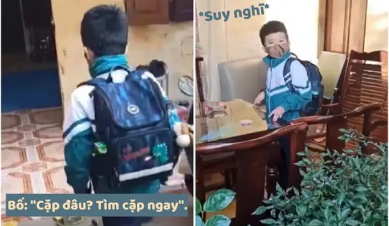 Tìm không được, cậu bé bất lực ngồi một chỗ, lắc đầu than "không biết". Trong khi đó, phụ huynh biết rõ vị trí của cái cặp vẫn cố "lầy lội" trêu con.