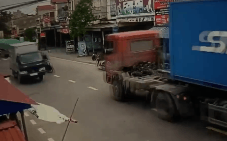 Xe máy của 2 thanh niên lạng lách để vượt trái xe tải nhưng gặp "biến". Cùng lúc đó, xe container ngược chiều đi đến, 2 thanh niên kẹt ở giữa. Chiếc xe máy lao vào xe container rồi bật vào thùng xe tải và văng ngược lại.
