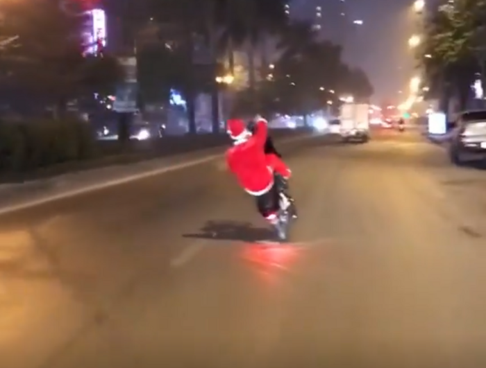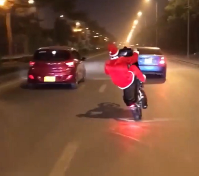 Trước đó, trên mạng xã hội Facebook cũng lan truyền đoạn clip dài hơn 1 phút về việc một nam thanh niên mặc quần áo “ông già Noel" đi xe Wave hiệu Honda liên tục bốc đầu xe, lạng lạc khiến cư dân mạng phẫn nộ.
