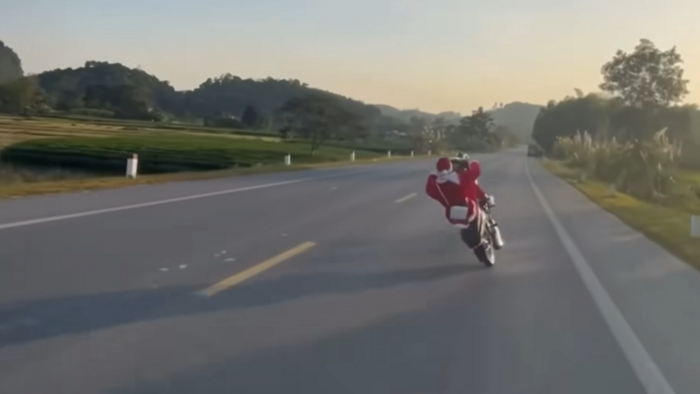 Một đoạn clip ghi lại cảnh thanh niên mặc đồ “ông già Noel” điều khiển xe máy và xe đạp di chuyển trên đường bốc đầu khiến nhiều người bức xúc.
