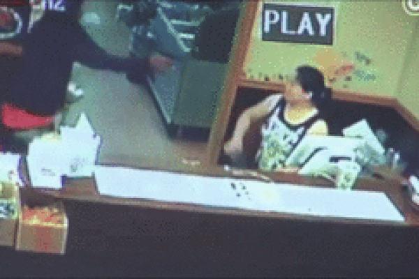 Lúc này, trong tiệm còn có hai nhân viên. Trong khi hai nhân viên chỉ biết đừng nhìn tên cướp lộng hành thì cô gái đã dũng cảm dùng tay không chống trả một cách quyết liệt. Dù đã cố gắng tấn công cô gái nhưng cuối cùng tên cướp đã phải bỏ chạy ra ngoài.