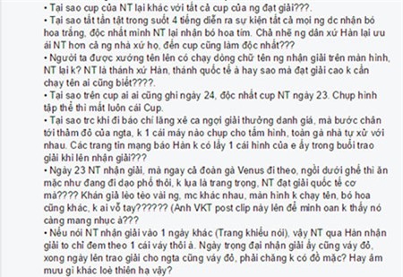 "Tất cả mn đều được tặng cúp và bó hoa màu trắng, riêng Ngọc Trinh thì "đặc biệt" được tặng hẳn bó hoa to màu tím. Lúc lên nhận giải, không thấy màn hình xứng tên..." - một cư dân mạng chia sẻ.