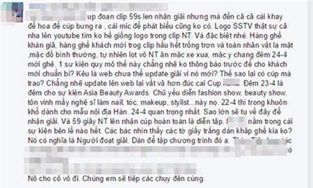 Cùng với ý kiến trên, trang cá nhân Nghĩa Nguyễn cũng chia sẻ: "Đây là video trao giải tổng duyệt... giống kiểu trao giải cho Hoa hậu... Thực chất không có giải nào là giải Bikini Queen... Giải này là giải tổng duyệt... hai MC cũng không phải là MC chính của ban tổ chức... Logo của SSTV cũng không phải Logo của hãng truyền hình này. Nó được lồng vào".