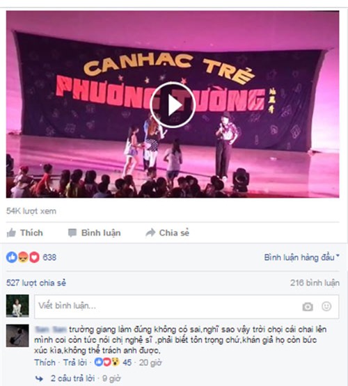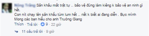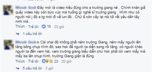 Ngay khi clip đăng tải, những ý kiến trái chiều nổ ra người bênh, kẻ chê. Nhiều người cho rằng nam danh hài khá nóng nảy, một số khác nhận định hành động như khán giả kia là thiếu tôn trọng diễn viên, vì thế hành động của Trường Giang hoàn toàn có thể hiểu được. Tuy nhiên theo một số người quan sát kỹ đoạn clip, khán giả ném chai lên sân khấu là vì mục đích trêu hai cô gái tặng hoa danh hài chứ không phải cố tình khiếm nhã với Trường Giang.