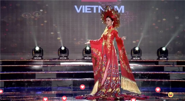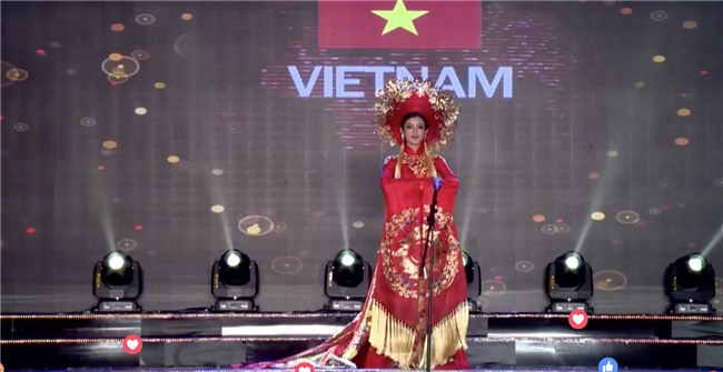 Đại diện Việt Nam chọn bộ áo dài màu đỏ lấy ý tưởng từ hoa văn và pháp lam cung đình Huế của NTK Ngô Nhật Huy cho phần thi trang phục dân tộc.