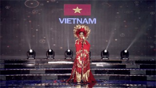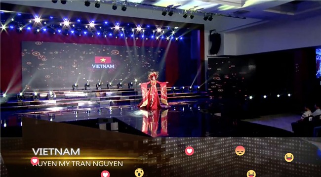 Đúng như dự đoán, đại diện Việt Nam - Huyền My đã không làm công chúng nước nhà thất vọng bởi màn trình diễn đầy tự tin. Trong trang phục truyền thống của nhà thiết kế Ngô Nhật Huy, Huyền My tự hào hô vang hai tiếng Việt Nam. Bộ cánh nặng hơn 30kg được lấy ý tưởng hoa văn và pháp lam cung đình Huế làm chủ đạo, riêng chiếc mấn mà Huyền My đội trên đầu nặng gần 8 kg.