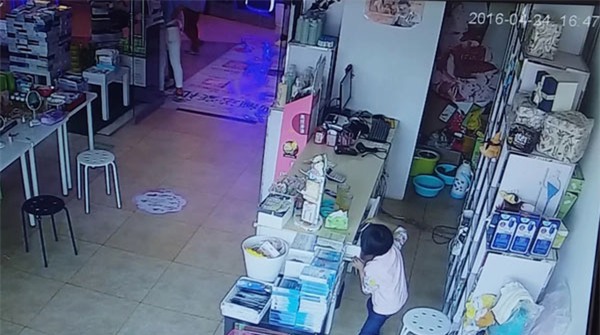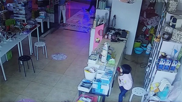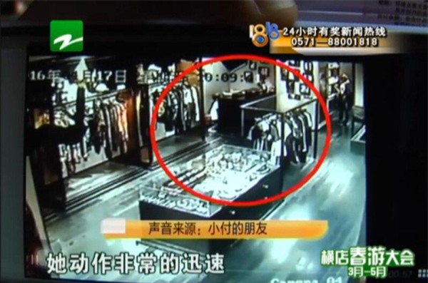 Sau khi khách đi hết rồi, cô nhân viên bán hàng trở lại quầy thì phát hiện điện thoại đã mất. Cô nhân viên họ Châu lập tức nhờ bà Vương gọi vào điện thoại của mình thì điện thoại đã tắt máy. Khi xem lại camera giám sát họ mới phát hiện chiếc điện thoại trị giá 6088 tệ (tương đương hơn 20 triệu đồng tiền Việt Nam) mà cô nhân viên này đã mất 5 tháng tiền lương mới mua được đã bị đứa trẻ đi vào lúc trước lấy cắp. Khi họ đi ra ngoài tìm thì nhóm người kia đã biến mất.