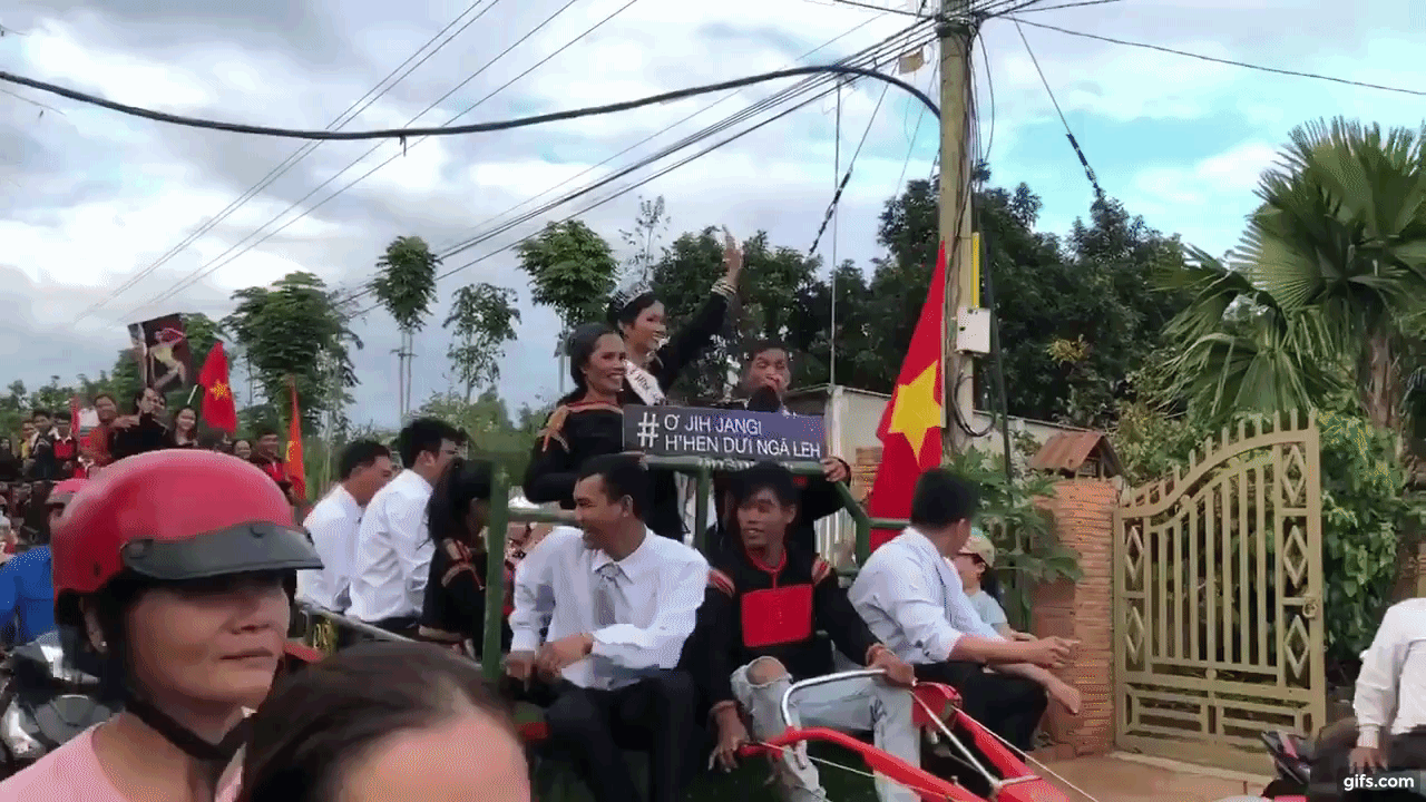 Đúng như mong muốn từ trước, H'Hen Niê đã được về thăm nơi mình sinh ra trên chiếc xe công nông.