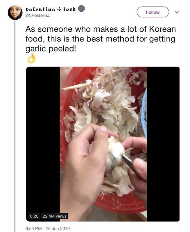 “Với kinh nghiệm nấu rất nhiều món ăn Hàn Quốc, đây là phương pháp bóc tỏi hiệu quả nhất”, người này viết khi đăng tải clip hướng dẫn.