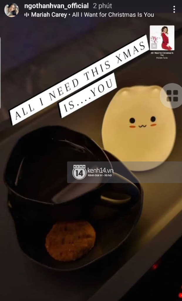 Về phần Ngô Thanh Vân, cô đã đăng tải story ăn lễ Noel tại gia đầy lãng mạn vào 21h và 22h cùng ngày. Thậm chí, nữ diễn viên kiêm đạo diễn còn ẩn ý chuyện tình cảm bằng dòng trạng thái: "All I need this Xmas is you" (Tạm dịch: Tất cả những gì em muốn trong Noel này là anh).